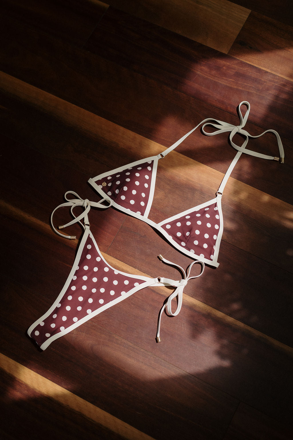 Minimal and versatile, this Cafe polka-dot pant features delicate side ties with contrast binding and tiny metal ring details. Designed for an itsy, low-coverage fit, finished with metal aglets and the signature Rhythm metal coin. Fully lined.