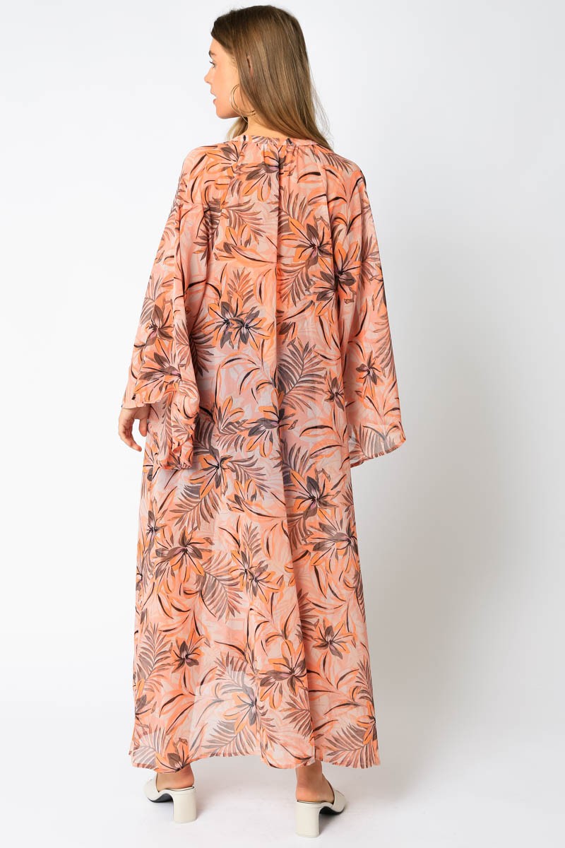 Our Chiffon Tropical Cover Up Dress features a relaxed fit and a long bell sleeve.