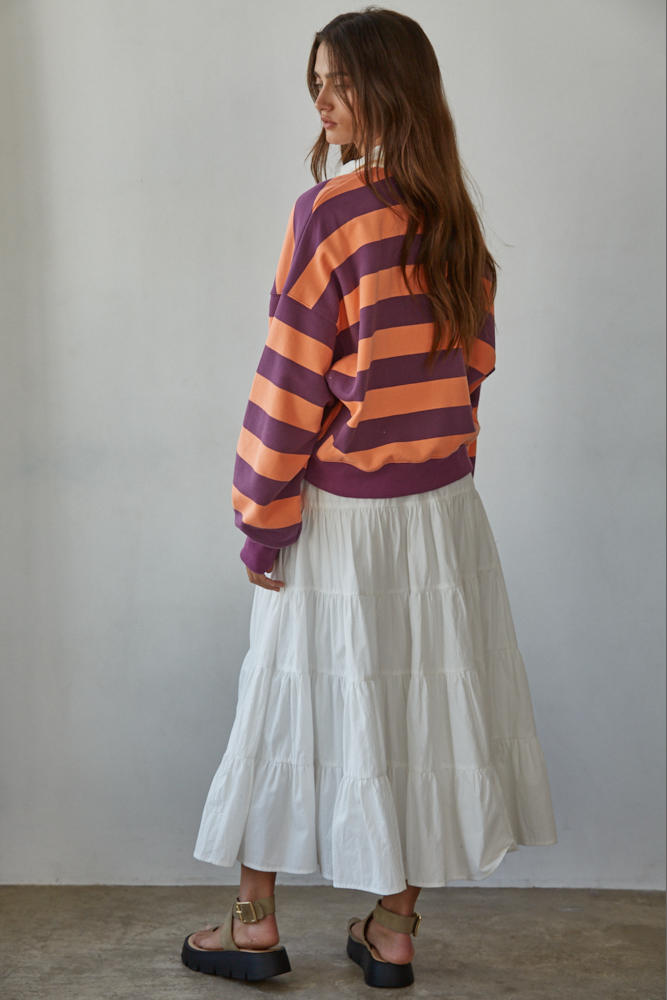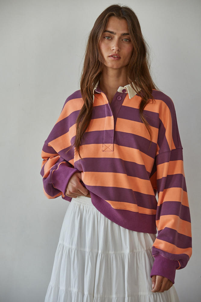 Cozy and cute! This striped collard pullover with the half button up detail is the perfect piece to take you from warm summer days to cool fall nights.