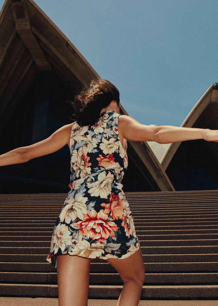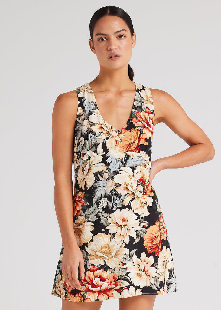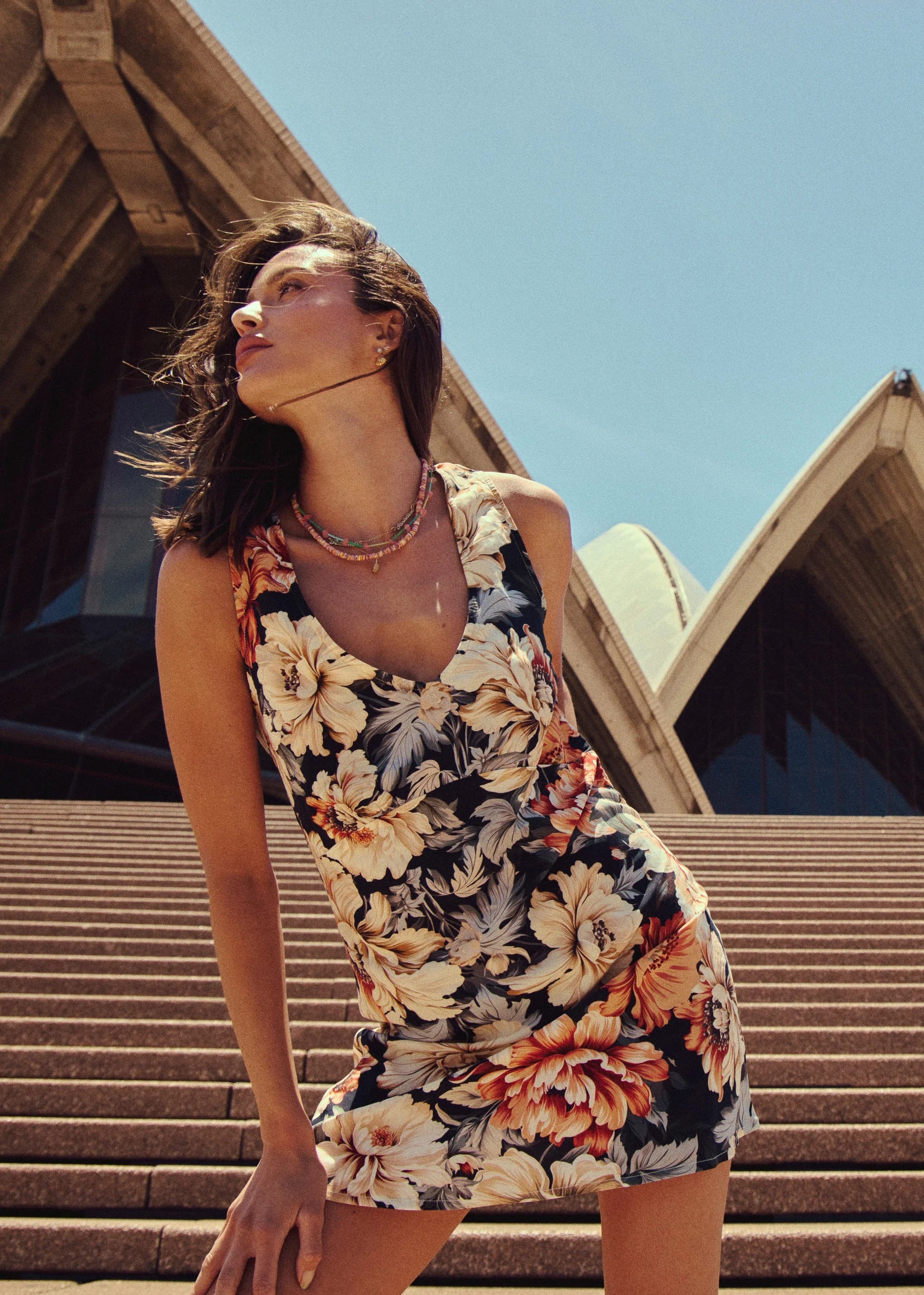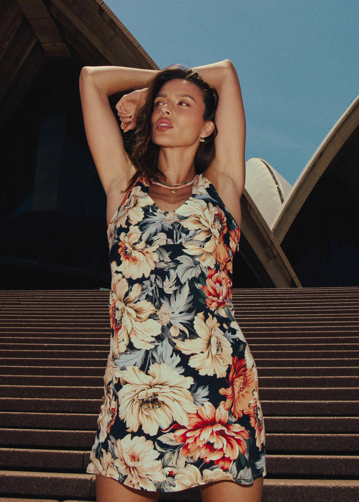 Featuring our vintage inspired floral, Panama. This effortless style features a V neckline with an under bust seam. The body is cut on bias and is crafted in 100% Rayon.