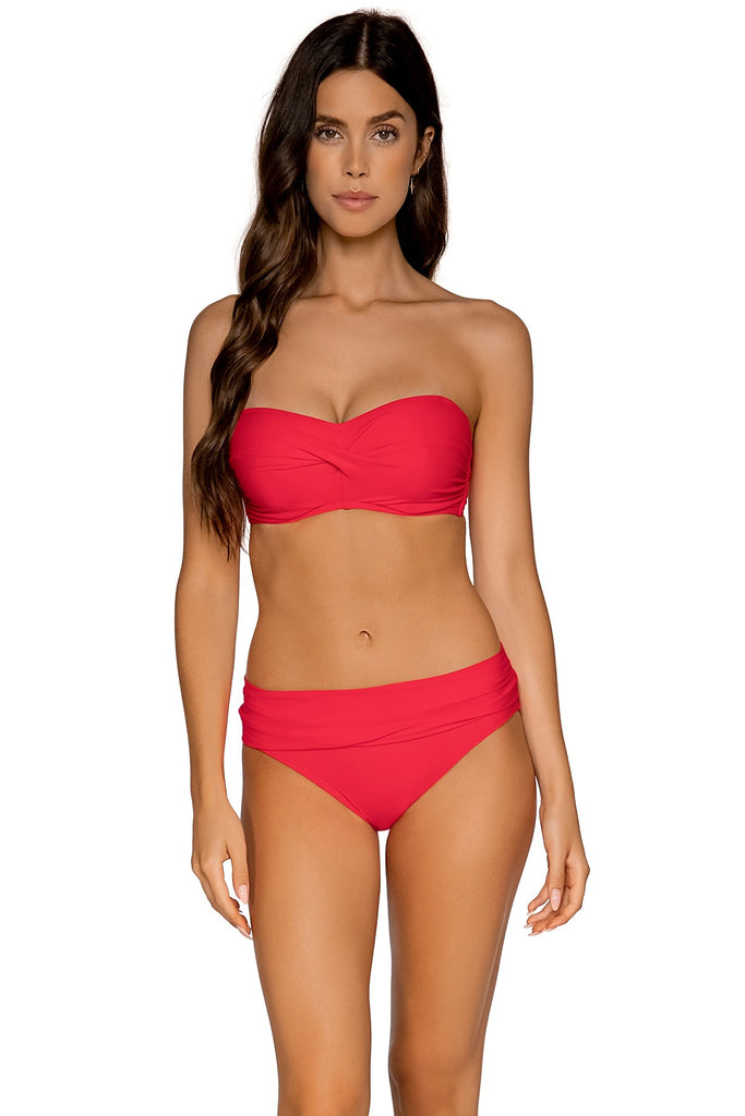Add a little flair to your unforgettable bottom with our shirred waist hipster. Features include shirred band with cinched back detail and matching front and back colored lining. Sits straight across the hip. Coverage: Moderate. *Top sold separately. Fabric Content: 87% Recycled Nylon, 13% Spandex