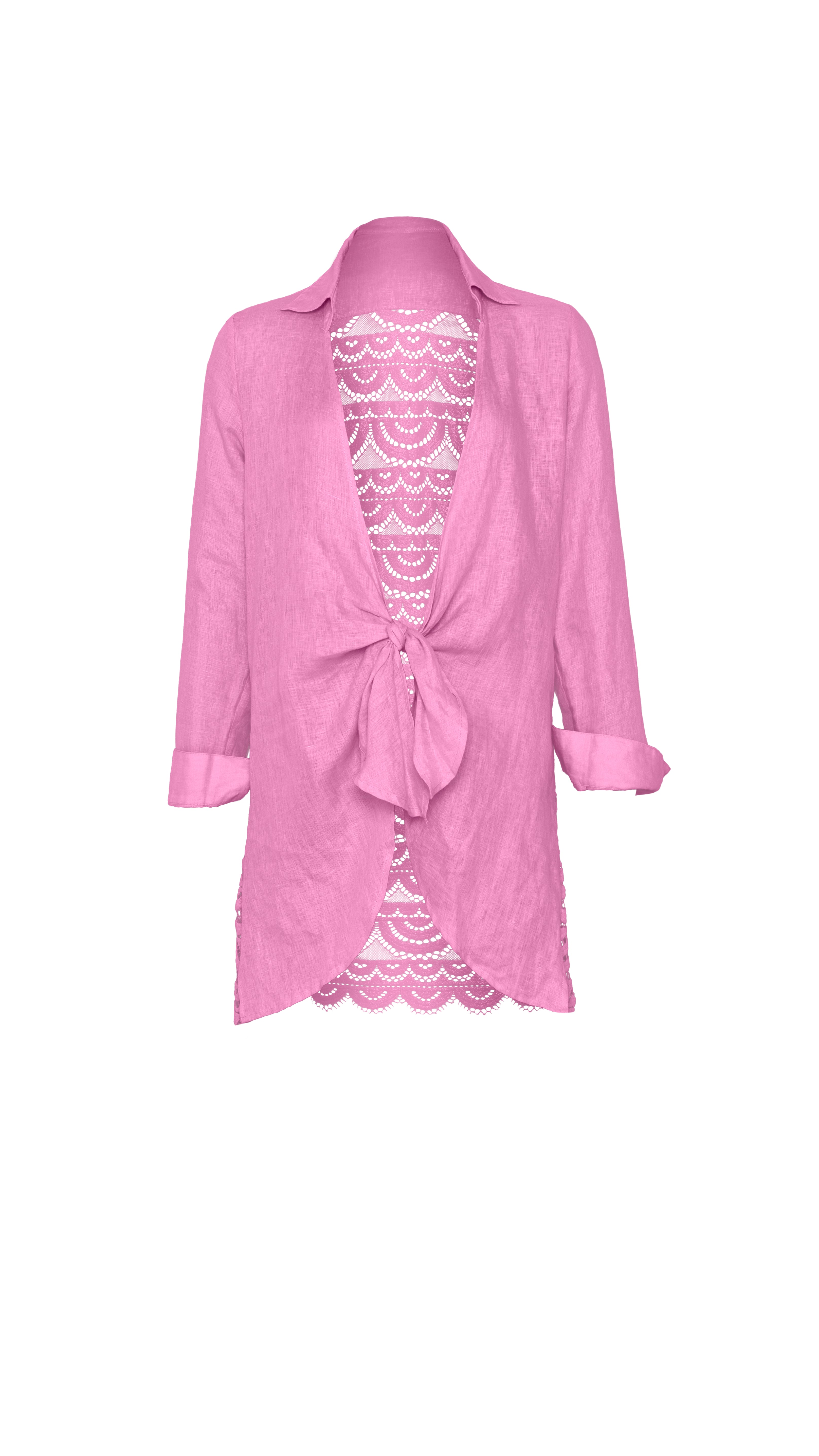 The Wisteria Lace Millie Tie Tunic is crafted from soft pink linen and finished with a statement back—featuring our iconic hand-cut, scalloped lace from shoulder to hem. Designed to tie at the waist, it layers beautifully over swim while adding a delicate, elevated touch to any beach look.