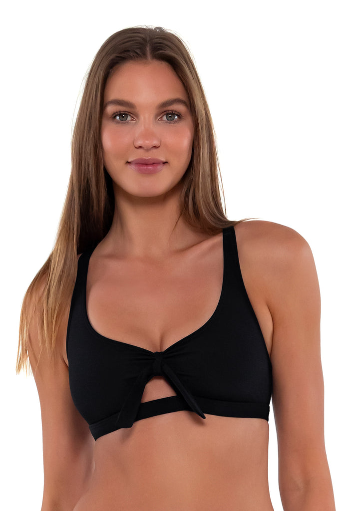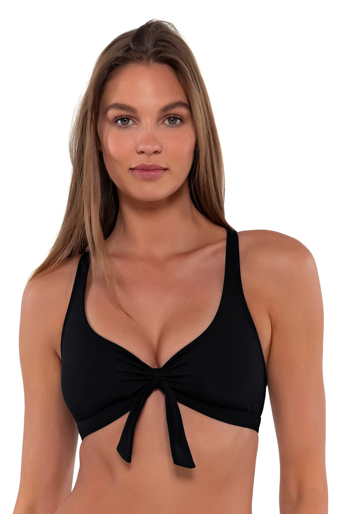 Functional, flattering, and customizable! Full adjustability in the back with criss cross strapping to ensure a perfect fit. Includes a removable front tie detail. Leave the tie off for a sports bra look or tie it in a bow for a deeper scooped front. Features include removable cups and matching colored lining. *Bottom sold separately. Fabric Content: 82% Nylon, 18% Spandex